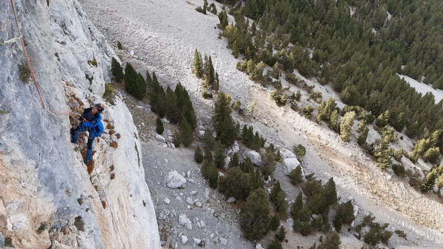 El jueves pronosticaban un día soleado y anticiclónico, por lo que el grupo volvió a retomar la senda de aproximación que en 1h30' lleva desde la pradera hasta la base del Libro Abierto para escalar esta vez Verticualidad (ED+, 350m, 7b+, 6c obl) y Vía del Sexto (ED, 350m, 7a, 6b+ obl).
