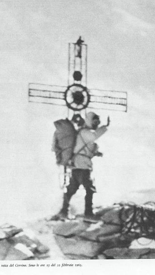 Un buen condicionante era que en 1965 se celebraba el centenario de la mítica primera ascensión, la de Whymper y sus seis compañeros de los que cuatro mueren, junto con la de Carrel pocos días después. Escalar abriendo vía por la norte del Cervino por una ruta incomparablemente más difícil que la abierta por los hermanos Schmid en 1931, sería un buen final. Y le tocaba el orgullo que, ante la derrota del mito que sin duda era, ya hubiera otros alpinistas preparados para ir “adonde Bonatti ha fracasado” cuando él se había quedado sin cordada.