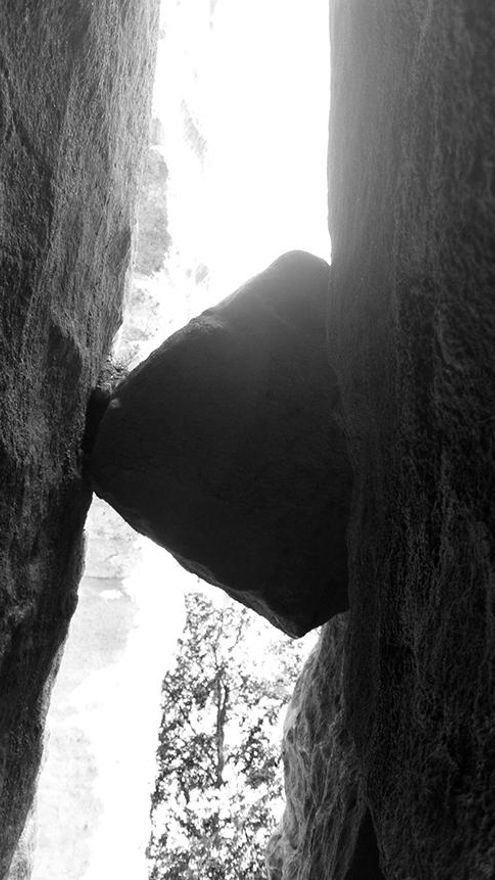Gano la chimenea centímetro a centímetro, y por inercia, por evitar el vacío, me sumerjo cada vez más en la oscuridad de las entrañas de esta fortaleza de arenisca... paso el bloque por detrás y lo lazo... recuerdo a Abratzky y decido no probarlo... A partir de ahí parece que la chimenea se te tira encima, pero te regala más y más presas en forma de franjas horizontales, y la calidad de la roca va mejorando hasta que al final tienes que salir por la fisura de la izquierda. También oigo campanas. La R, una argolla enorme, ya está allí.