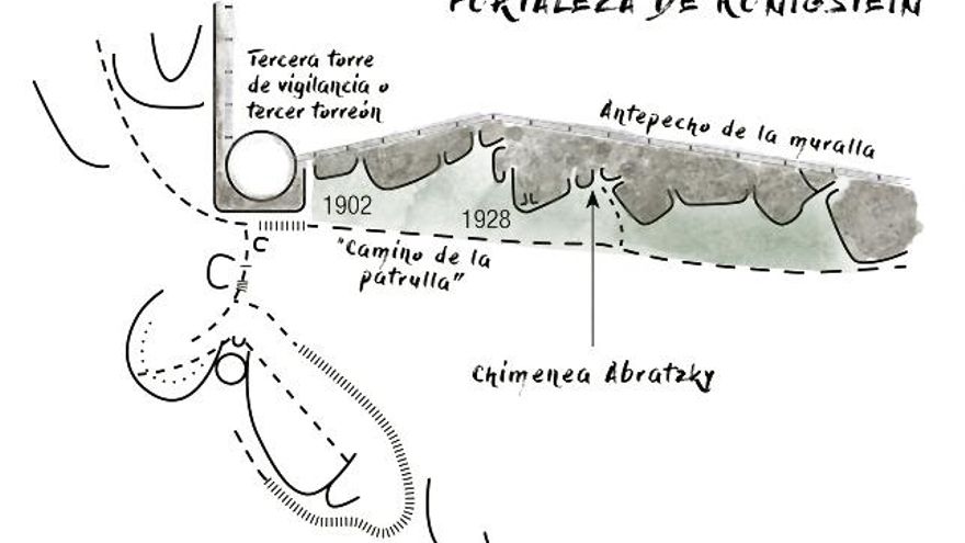 En Königstein hay dos buenos caminos que dan acceso a la fortaleza. Uno desde la carretera de Pirna. Otro desde la calle junto al ayuntamiento y la iglesia. En cualquier caso, contad con un agradable paseo por un espeso bosque de unos 20 minutos. A pie de muralla tomad el llamado “patroullen Weg”, Camino de Patrulla, y recorriendo la muralla por su base, lejos del barullo de los turistas, llegáis a un enorme cartel que os recuerda la prohibición de superar el antepecho de la muralla. Es el pie de vía. También en la muralla encontraréis la inscripción “1928”, la vía está unos 6 metros a su derecha.