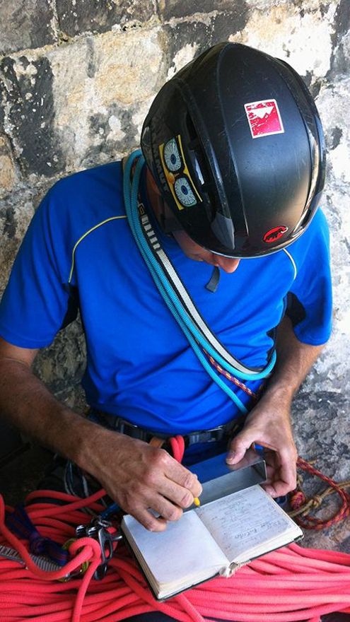 Recupero a mi amigo, y cuando llega cumplimos con el protocolo del libro de cima. Es el segundo libro de cima de la historia, sustituyó al anterior en 1982, y es así uno de los pocos vestigios vivos de un país que ya no existe, y de una cultura de la escalada que sólo aquí, lejos del wifi, parece sobrevivir. Según el librito, este año somos la vigésimo tercera cordada que asciende por la chimenea.
