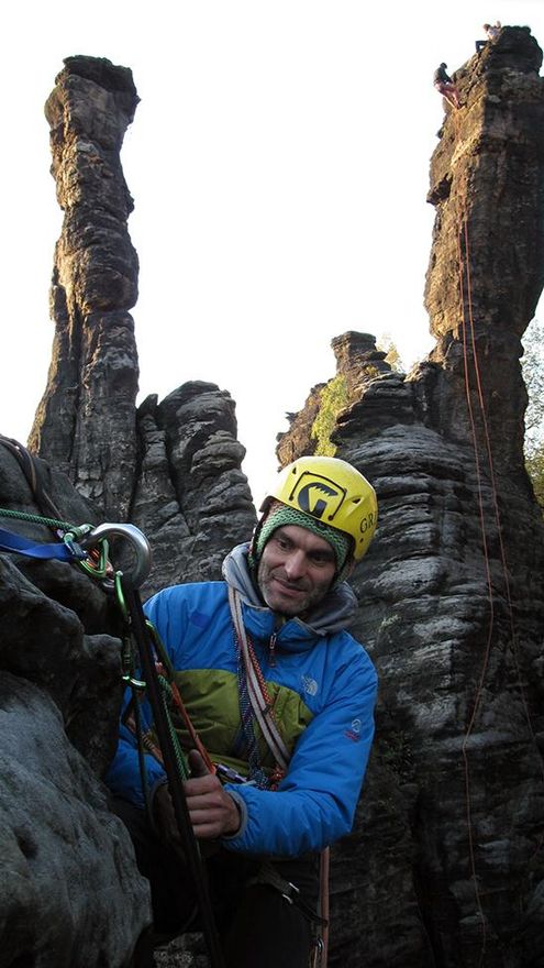 Más empírico, neutro y conciso no se puede ser. Y como la realidad es más bonita vivirla realizando sueños, nos vamos a escalar “nuestra” chimenea, con permiso de Abratzky. ¡El permiso, claro, necesitamos el permiso! y las reglas... Estamos en Sajonia, Alemania: nada de magnesio, nada de fisureros, ni friends, sólo nudos empotrados, piel y cordinos, una argolla en 35 metros, y nada de casco si no quieres ser tomado como un mísero forastero. Llueve. Así que vamos a visitar a Abratzky a pedirle permiso. Cementerio de Johannis, en Dresden, agosto del 2017, 169 años después de su escalada. El Johannis Friedhof es como un parque, sin dramatismos, pedimos permiso para las fotos en Administración, y allí una chica amabilísima nos cuenta sobre el “cheminero”. El jardinero, también majísimo, nos da la última indicación sobre la ubicación de la lápida de arenisca –no podía ser de otro material- bajo la que descansa nuestro escalador. Pequeña charla mística: Danke, Herr Abratzky, usted nos abrió el camino. Permiso concedido.