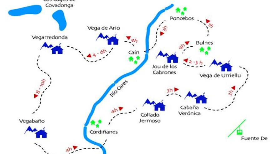 Se puede empezar por cualquier población, como Poncebos, Caín o los Lagos. Nosotros planteamos empezar por Cordiñanes o Poncenos por dos razones. Una es no empezar por los Lagos de Covadonga que están saturados, otra es porque la etapa de Cordiñanes a Ario supone una prueba de nivel, ya que la Canal de Trea es lo suficientemente exigente como para saber si tenemos la condición física para realizar este circuito. Tenemos que ser conscientes que el Anillo de Picos no es un recorrido que pueda hacer cualquier persona, esta ruta requiere de una buena condición física y un poco de experiencia en montaña, porque Picos no es fácil de recorrer.