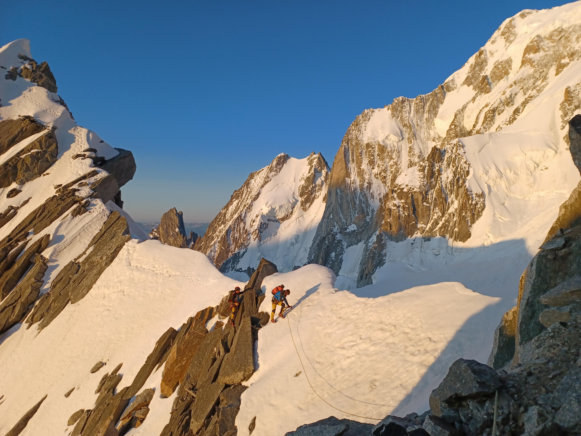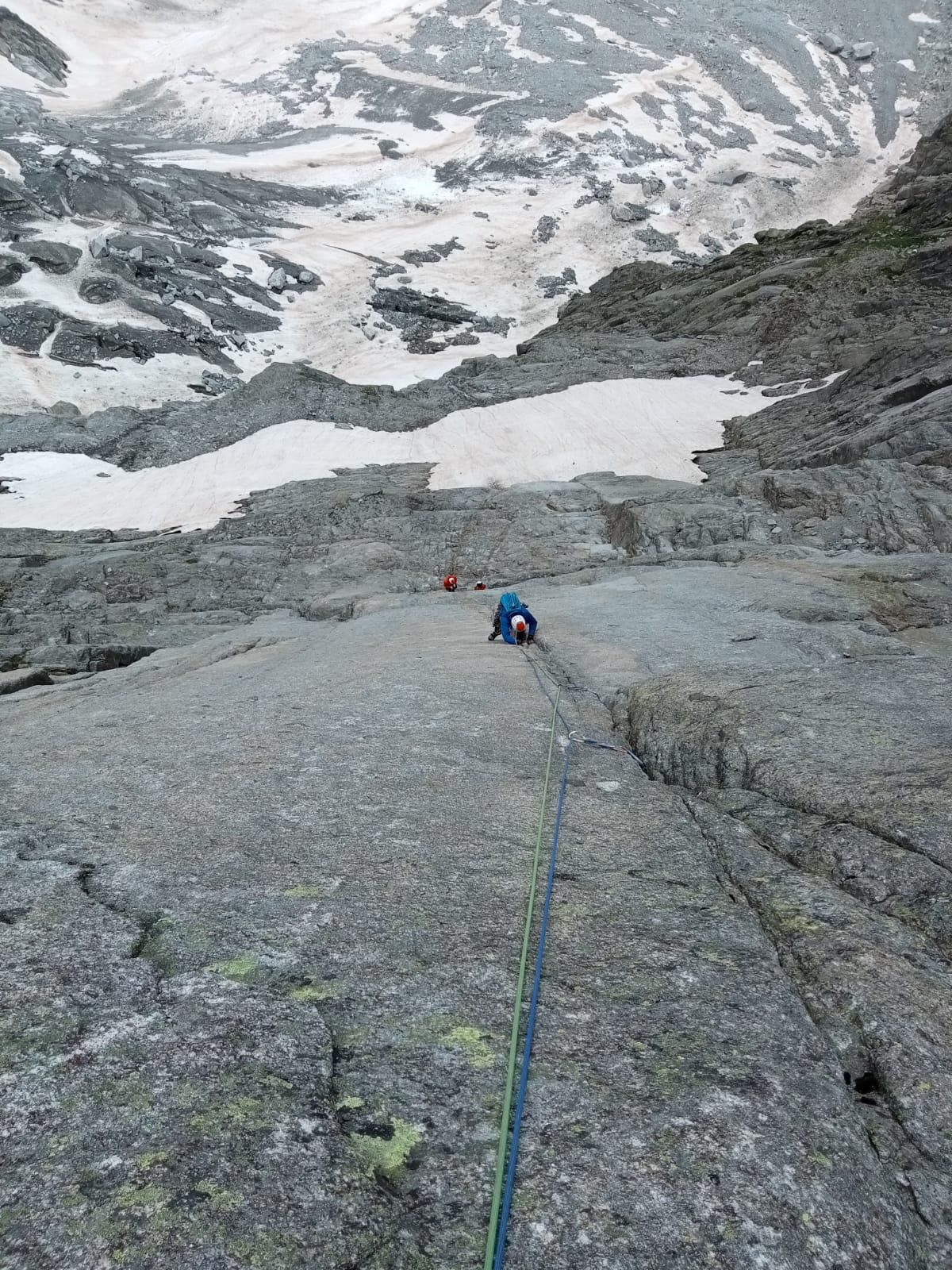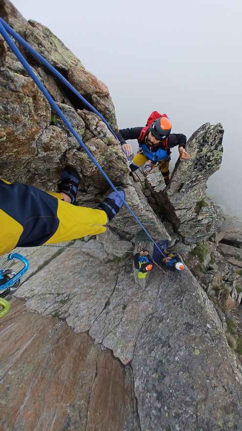 Mientras una cordada se desplaza hasta el refugio de la Fourche para trazar la Arista Kuffner desde allí, otra recorre la Arista Integral Rochefort- Cancio -Bocalatte.