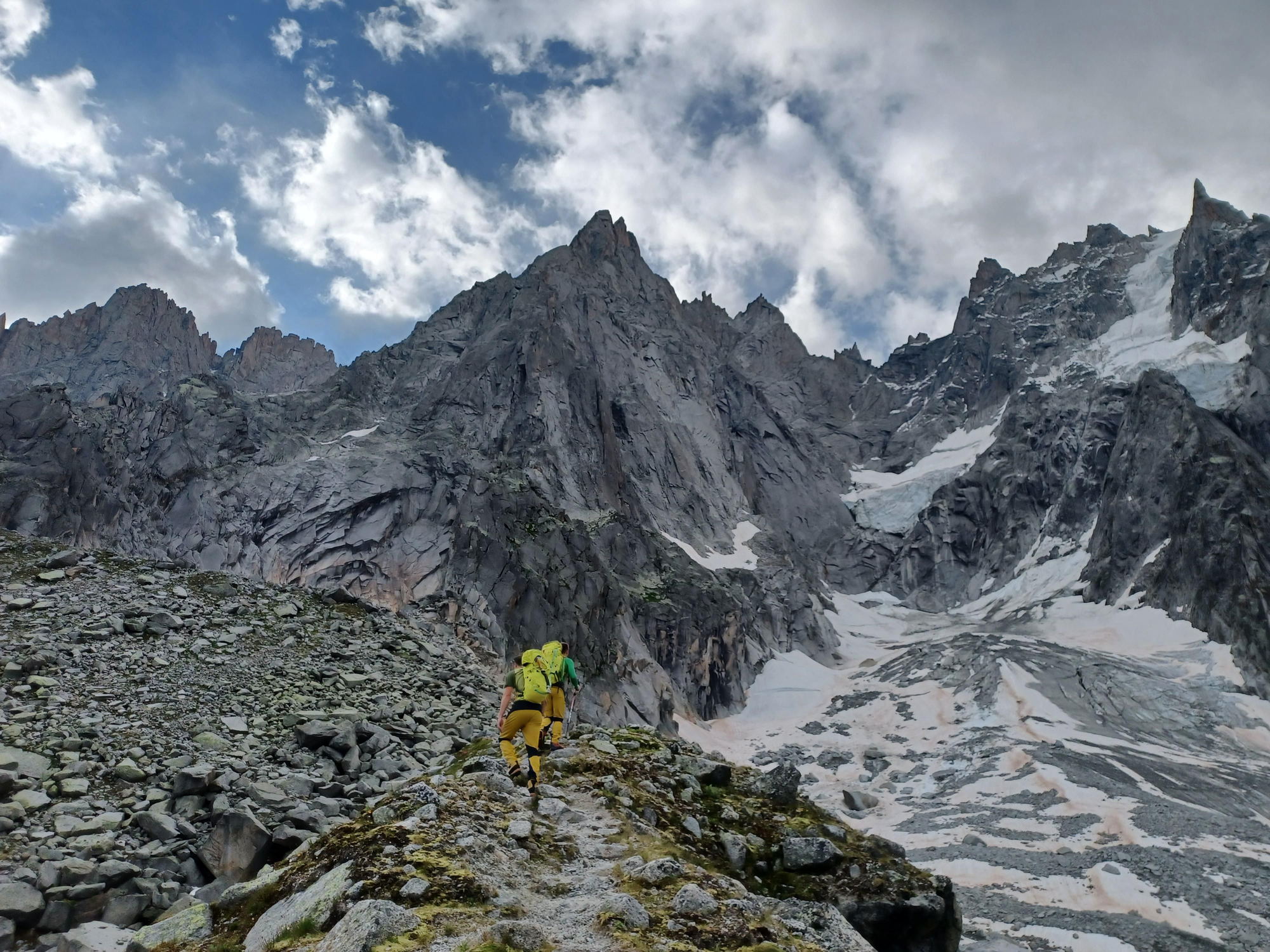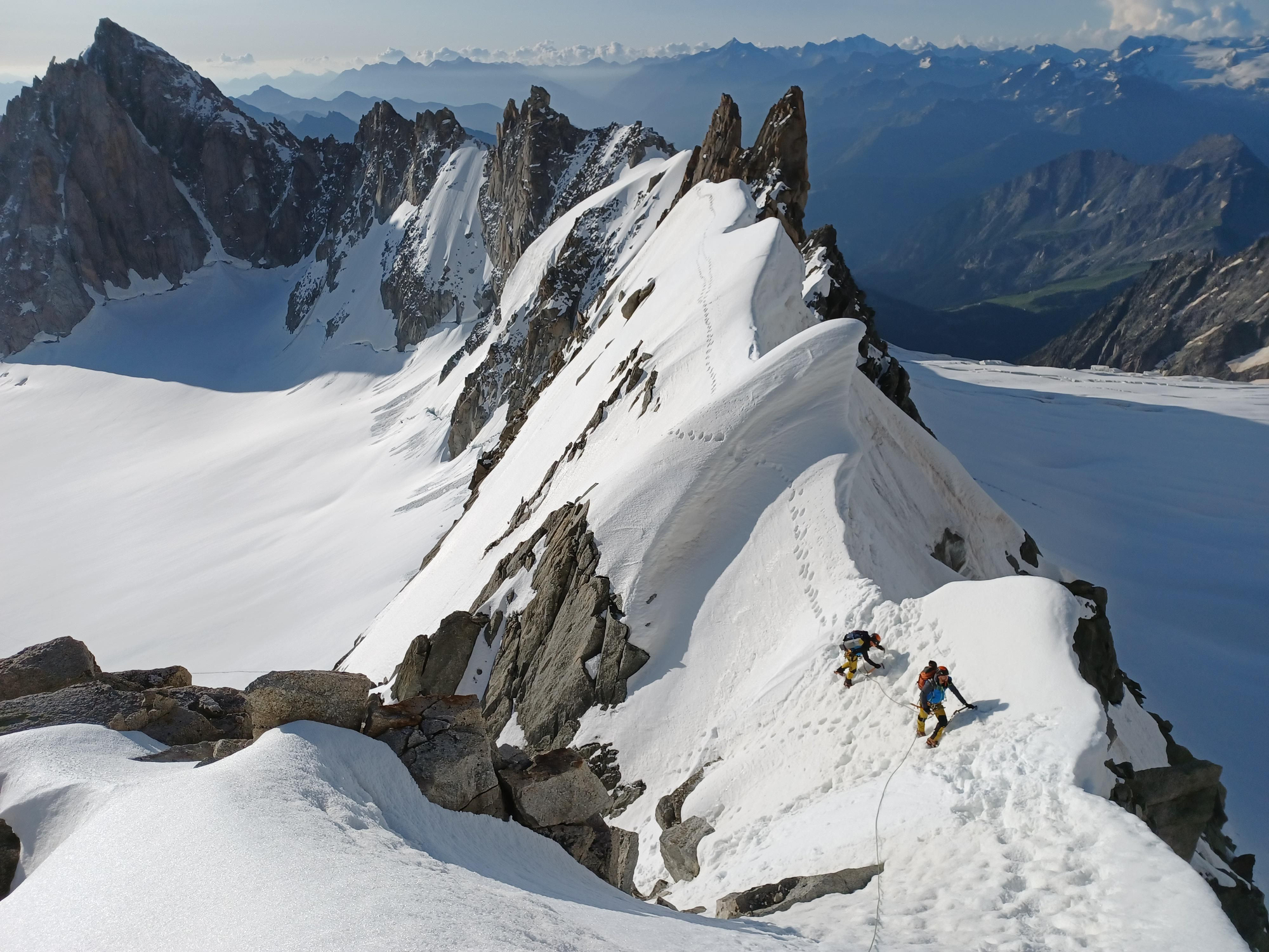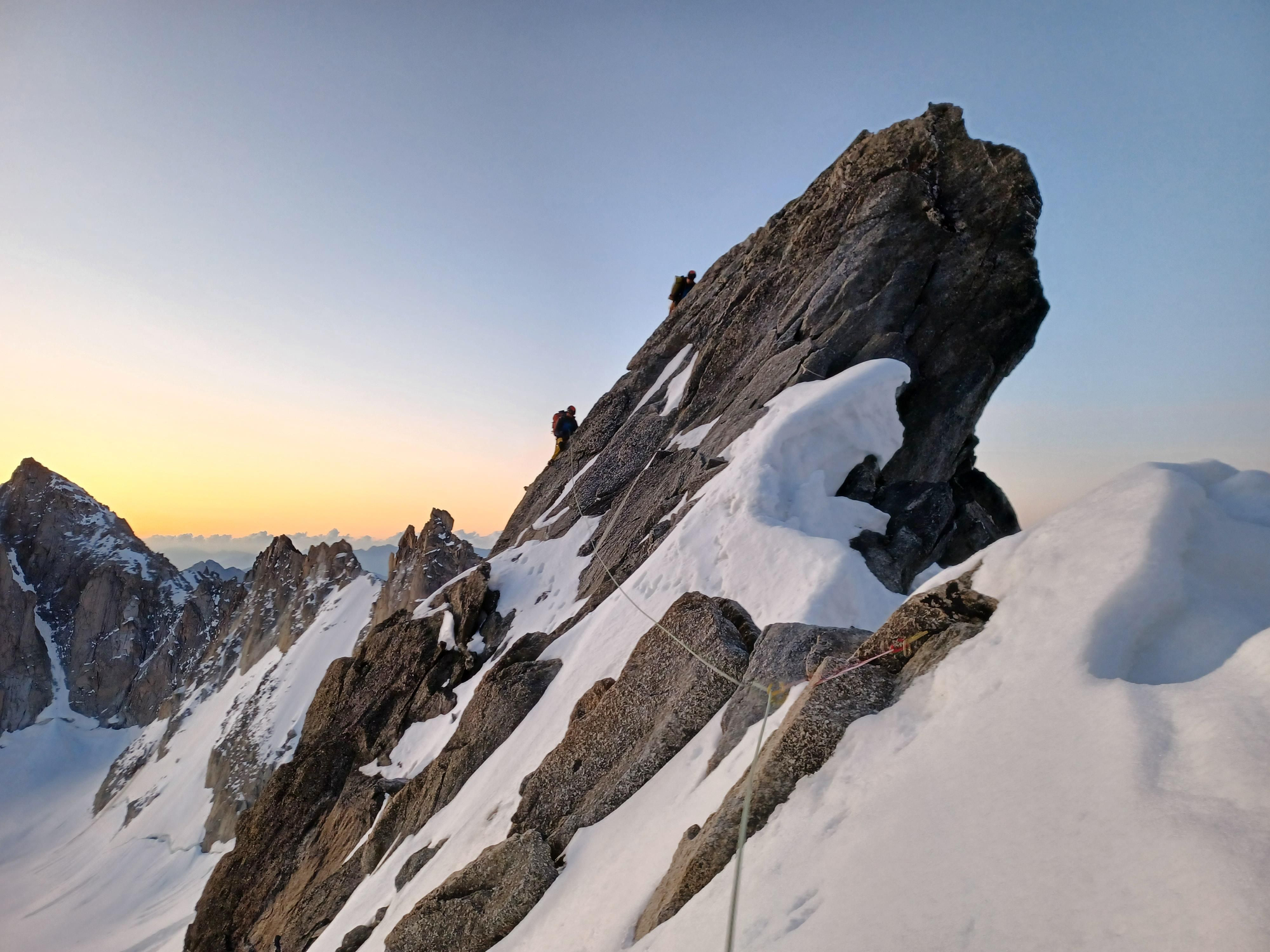 Mientras una cordada se desplaza hasta el refugio de la Fourche para trazar la Arista Kuffner desde allí, otra recorre la Arista Integral Rochefort- Cancio -Bocalatte.