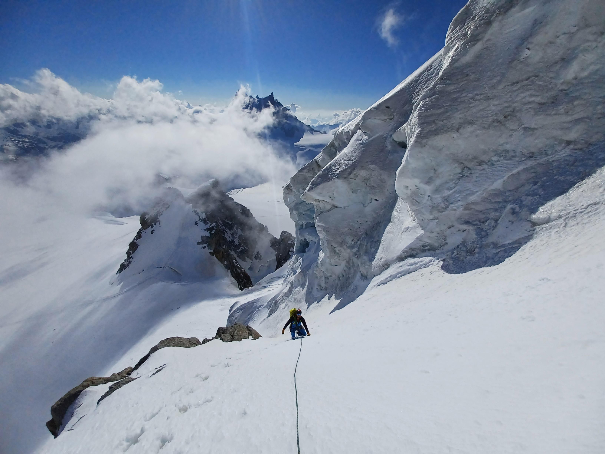 Durante estos primeros días se realizan actividades de roca y nieve/hielo en la zona de la Aguille de Midi, por encima de los 3800m, y varios picos de altura por encima de los míticos 4.000 metros. Ante el cambio de méteo a peor pronosticada debido a la entrada de un frente de sur, se toma la decisión de intentar hacer alguna actividad más larga y de mayor envergadura.