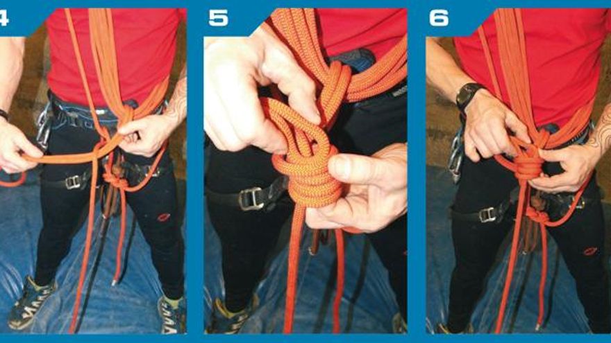 Continuaremos con la gaza y la pasaremos por debajo de la cuerda de nuestro compañero. Continuaremos dando dos vueltas sobre la cuerda que llega hasta nuestro compañero e introduciremos ésta por esas dos vueltas (Ver fotos 4, 5 y 6).