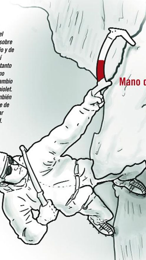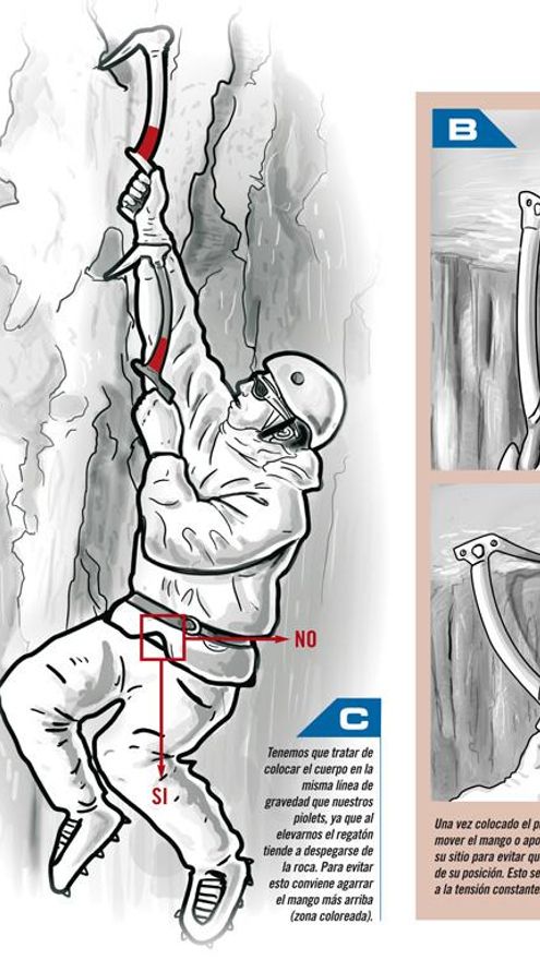 Si bien escalamos en hielo o roca lo más importante es el gancheo, ya que en hielo, tras una buena pegada, nuestra seguridad respecto al movimiento depende de él, y en roca exactamente igual. Los crampones exactamente igual, teniendo la particularidad de que éstos se pueden emplazar en los mismos puntos donde antes lo hicimos con los piolets.