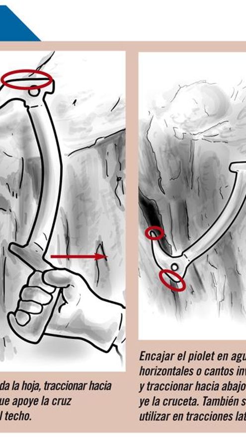 Siempre que encontremos un agujero o fisura invertida tendremos que utilizar el piolet con palanca sobre la cruz invertida. Este piolet, en ocasiones, también se utiliza como apoyo de pie teniendo en cuenta que luego tendremos que recuperarlo.
