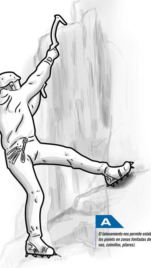 El talonamiento viene muy bien para aportarnos equilibrio en columnas o pilares en posiciones donde no podemos movernos demasiado por el poco espacio de trabajo. También podemos emplearlos en movimientos en equis, con nuestro cuerpo en horizontal en vez de vertical, teniendo total equilibrio para así liberar parte del cuerpo o poder llegar más alto con el piolet.