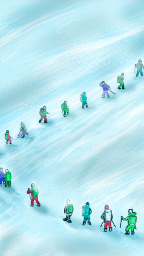Cuando las diagonales sean largas debemos evitar que la mano que se encuentra al monte permanezca demasiado tiempo por encima del nivel del corazón, dificultando el riego sanguíneo y sucesivamente el enfriamiento del miembro. Esto se evita acortando el bastón, si se puede, o cogiéndolo más abajo si ya está preparado para la travesía o “modificándolo” con una cinta que nos garantice un buen agarre más abajo.