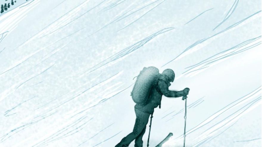 1. Lo primero que tenemos que hacer es colocar el esquí que se encuentra hacia el valle lo más estable posible evitando su deslizamiento. Esto se consigue colocando el esquí perpendicular a la línea de máxima pendiente. Una vez conseguido esto colocaremos el bastón que se encuentra hacia el monte algo retrasado respecto al cuerpo para que no nos moleste cuando giremos el esquí , el otro bastón nos servirá para garantizar una buena base y equilibrio durante la maniobra.