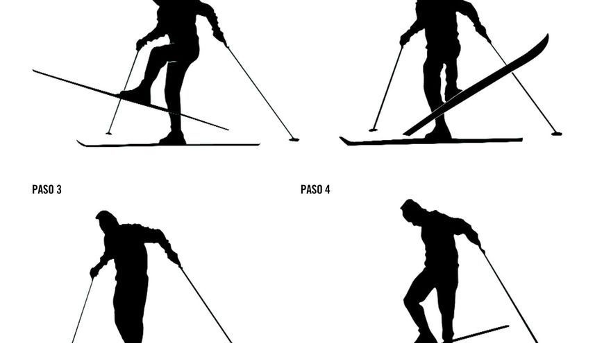 4. Seguidamente, con la pierna en el aire y estirada hacia detrás para que el esquí no se arrastre, pasaremos la punta cerca de la bota del monte a la vez que giramos el cuerpo para así poner los esquís nuevamente en paralelo. De esta manera también evitamos que el esquí se golpee con el bastón.