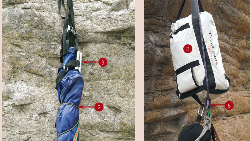 El lugar más lógico es debajo del petate que llevemos (2). Éstos suelen llevar un lazo resistente en la parte inferior del mismo donde poder chapar un mosquetón. Debido a la forma que adopta la hamaca en funda y a su ligereza, éste es el sitio más recomendable. Por donde pase el petate pasará la hamaca. Sujetaremos el petate a la cuerda de izado mediante un nudo de ocho o siete, con un mosquetón para poder engancharlo y desengancharlo a nuestro antojo (1). Antes de esto es recomendable introducir un cuello de botella de plástico de manera que ayudará a que la carga no se enganche tanto en los techos por el nudo. Seguidamente en el extremo de la cuerda haremos un nudo para poder enganchar con un mosquetón la funda del techo de la hamaca, y a su vez, con ese mismo mosquetón, anclaremos debajo del petate (6). Si el techo de la hamaca no cabe en la funda de la hamaca, éste puede ser un buen sitio para sujetarlo con otro mosquetón independiente (4). También es el sitio ideal para atar la cuerda del escalador que está recuperando el material de la vía, de tal forma que si la carga se engancha en algún techo pueda moverlo y garantizar mejor su izado. Éste siempre tendrá que estar por encima de la carga y nunca debajo, no sea que por alguna razón se caiga algo y le pueda golpear (5).