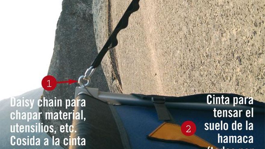Lo más habitual es adquirir una de dos plazas, ya que su precio es inferior a dos hamacas de una plaza y en caso de escalada en solitario tendremos más espacio. Es fundamental que tenga un buen refuerzo en la zona de contacto con la pared, unas hebillas resistentes, un sistema de rápido montaje, un chasis sólido y, además, que sea fácil de reparar si tenemos que hacerlo en la pared. Mirad que lleve aletas de tensado de suelo para que no se hunda y poder dormir mejor. No olvidéis también comprobar si se puede tensar estando encima y si hay piezas de repuesto por rotura o pérdida. Es importante que tenga un buen diseño y acabado.