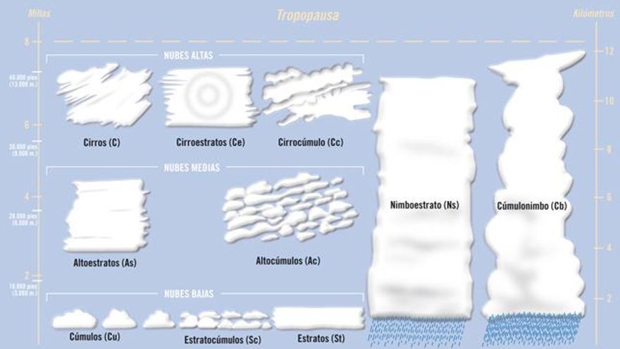 La parte nubosa de la atmósfera se extiende debajo de una “tapadera” invisible llamada tropopausa. Las nubes no pueden atravesarla y una de las pocas veces que podemos ver su efecto es cuando las nubes de tormenta extienden sus yunques debajo de ella. La capa que hay debajo de la tropopausa se denomina troposfera y todos los procesos meteorológicos de interés tienen lugar en esta zona. Las nubes de la tropopausa se distribuyen de una forma bastante clara en tres pisos o niveles. Las más altas son nubes de hielo deshilachadas que se encuentran a una altura superior a los 6 km. Todas estas nubes tienen nombres que empiezan con “cirro-”. Las más bajas son nubes formadas por gotas de agua que están por debajo de los 2 km. y cuyos nombres no tienen prefijo. Entre estas dos clases de nubes se encuentran las nubes del nivel medio que llevan el prefijo “alto-”.