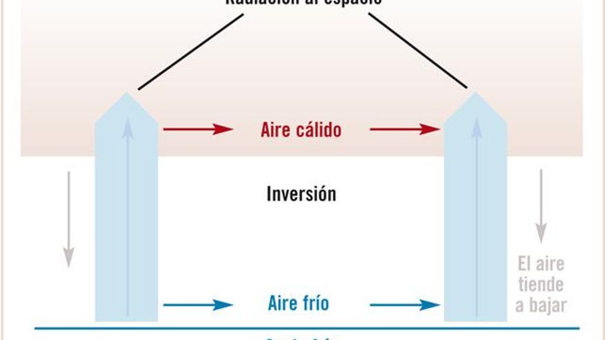 Supongamos que la noche está despejada o parcialmente nubosa. La tierra (pero no el mar) se enfría rápidamente por la noche debido a la radiación. Puesto que el aire del día anterior ha sido calentado en un considerable grosor, se produce una inversión (crecimiento de la temperatura con la altura) entre la capa de aire que está cerca del suelo y la capa de aire más alta. Esta inversión aumenta al llegar la noche y alcanza su mayor intensidad al amanecer. El efecto de la inversión es el de una tapadera que impide el ascenso del aire subyacente.