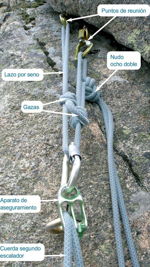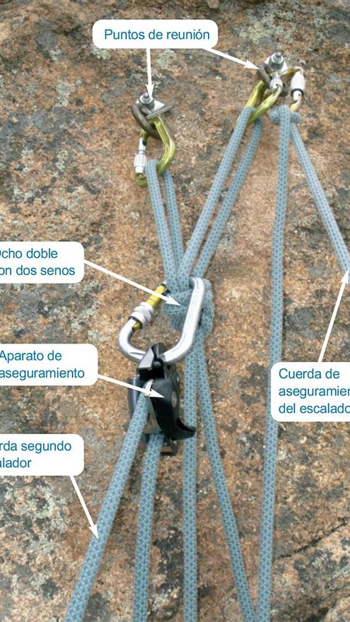 Lo normal es hacer un aro de cuerda de 240cm. con el seno de un ocho doble. Éste lo introduciremos por uno de los mosquetones, y colocando el nudo que forma el aro próximo al mosquetón, pero no pegado, calcularemos donde quedaría el punto central de la reunión. Esto es sencillo de averiguar sobreponiendo la cuerda sobre el otro seguro y viendo dónde quedaría el punto central. Una vez sepamos esto realizaremos un primer nudo sobre las dos cuerdas hacia el lado de la cuerda que hemos introducido por el mosquetón, y unos 20/30cm. más abajo el siguiente. Pasaremos el otro seno que se ha formado por el mosquetón y quedará una “U” con dos nudos. La parte inferior de la “U” será el punto central donde colocaremos el mosquetón de seguridad sobre uno solo de los cabos, consiguiendo un buen reparto de la carga sobre los anclajes aún con movimiento, y en caso de saltar uno de éstos recibirá el otro anclaje un impacto mucho menor. El cabo de anclaje del escalador tiene que ir también al punto central de la reunión para que su peso también se reparta sobre los anclajes y no esté solamente sobre un punto.
