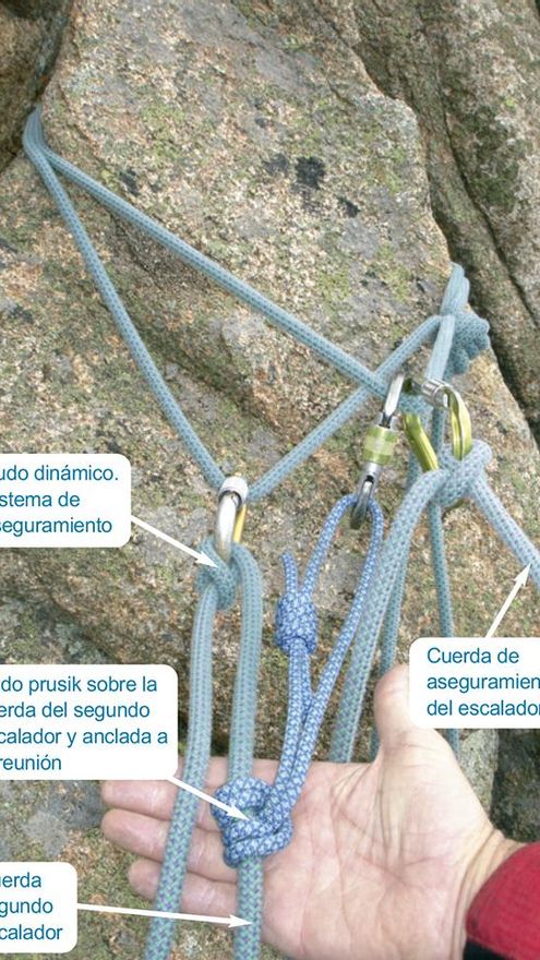 En caso de no tener un aparato para asegurar a un segundo, o si decidimos emplear un nudo dinámico por alguna razón, es conveniente colocar un nudo de prusik sobre la cuerda del segundo escalador y anclarlo al punto central de la reunión. De esta manera nos garantizaremos más seguridad para el segundo escalador en caso de suceder algún imprevisto.