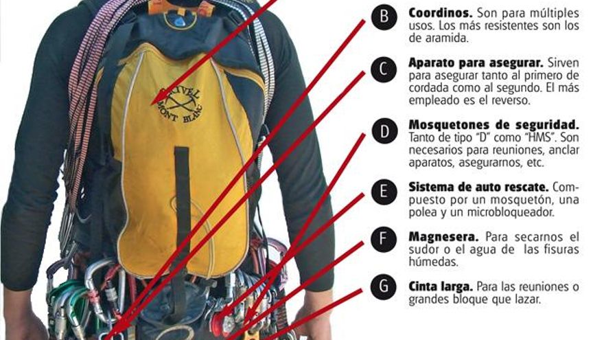 En la parte trasera de nuestro arnés llevaremos colgados todos esos artículos que no empleamos constantemente como son los mosquetones de seguridad de tipo “D” que son los mas resistentes, de tipo “HMS” que son los mas polivalentes, coordino de distintos tamaños para montar puentes de roca, anudar algún clavo viejo, realizar algún nudo bloqueante, etc. También conviene llevar algún maillon por si tenemos que realizar una maniobra en la cual tengamos que abandonar algún mosquetón, un bloqueador-descendedor, un saca figureros, una navajita, etc.