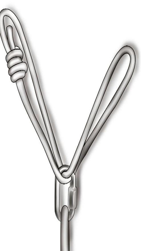La reunión que más suelo utilizar en periodo estival es el triángulo de fuerzas Equalette, ya que reparte muy bien las cargas entre los seguros y permite algo de movilidad respecto al punto central. La novedad está en introducir una argolla inoxidable de descuelgue para utilizarla como punto central de reunión, permitiendo que la Equalette reparta la carga por igual y que en caso de salirse alguno de los seguros, no haya peligro de que se pueda cargar todo el peso sobre la parte más débil del mosquetón central, el cierre o gatillo. Además este tipo de reunión se realiza con un cordino de 7mm de poliamida que hará que todo el impacto o caída se reparta y dinamice mucho mejor. El ocho, que hoy día está casi en desuso para el alpinismo, se puede emplear para rapelar e incluso dinamizar un péndulo, etc. También debo añadir que es un elemento que sirve para organizar y limpiar la reunión.