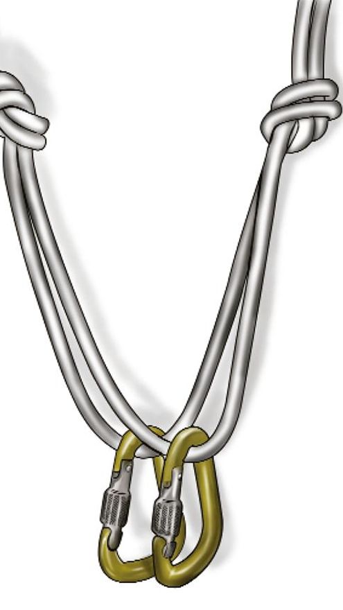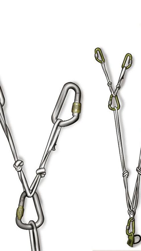 Sin embargo, para la época invernal me decanto más por una reunión sin ningún tipo de nudos como ocurre con el triángulo de fuerzas semibloqueado, formado por dos aros de cinta cosida. Uno con el doble de longitud que el otro para así poder montar un triángulo de fuerzas ecualizado, garantizándome el punto central de la reunión con un ángulo que nunca exceda de los 45º. El otro aro, de inferior tamaño, reducirá la distancia a recorrer del punto central cuando un seguro se sale y además evitará que el mosquetón que hay en el seguro que ha saltado golpee fuertemente contra el mosquetón central, algo que hay que evitar cuando las temperaturas son bajas y debilitan la resistencia de los metales.