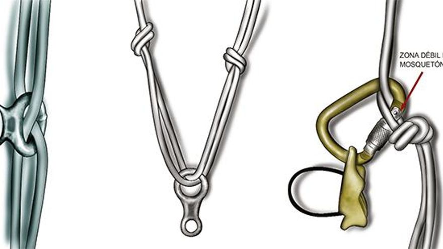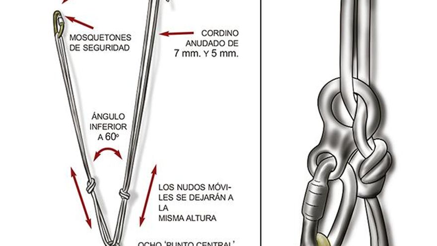 El material que suelo utilizar es un cordino de poliamida de 7mm de diámetro y 5m de longitud, y aunque éste es algo menos resistente que uno de dyneema o kevlar, lo prefiero. Las razones son la comodidad a la hora de anudar o manejar el mismo y aún más importante, su funcionalidad dinámica a la hora de absorber una caída, garantizándonos un mejor reparto de la energía producida sobre los anclajes, para intentar que éstos trabajen por igual respecto al punto central de la reunión.