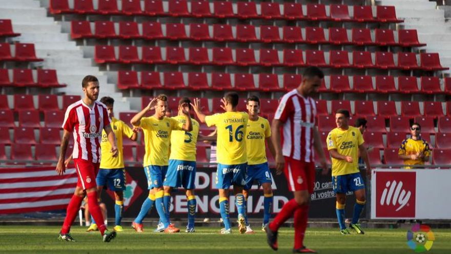 Pero fue el Girona, en el 58, con un remate de Timor tras un centro de Matamala, el que estuvo a un paso de deshacer la igualdad. Los goles llegaron en el tramo final del encuentro. En el minuto 81, Máyor culminó un contraataque del equipo canario (0-1) y poco antes de concluir el choque, David Juncà cometió penalti a Asdrúbal. Apoño marcó el segundo y definitivo gol (0-2).