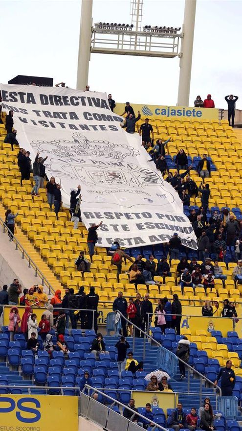 Durante el partido en las gradas se desplegaron dos grandes pancartas, en una de ella, en la Grada Sur, se leía el siguiente mensaje: “esta directiva nos trata como visitantes. Respeto por este escudo y esta afición”, acompañada de una gran foto del escudo de Las Palmas.