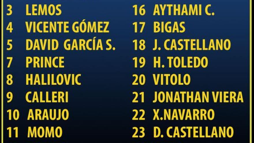 La relación completa de dorsales es la siguiente: 1 Lizoain, 2 David Simón, 3 Lemos, 4 Vicente Gómez, 5 David García, 7 Prince Boateng, 8 Halilovic, 9 Calleri, 10 Araujo, 11 Momo, 12 Macedo, 13 Chichizola, 14 Hernán Santana, 15 Borja Herrera, 16 Aythami, 17 Bigas, 18 Javi Castellano, 19 Hernán Toledo, 20 Vitolo, 21 Jonathan Viera, 22 Ximo Navarro, 23 Dani Castellano y 24 Tana.