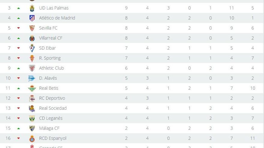 La tabla muestra que solo el Real Madrid (con 12 puntos, doce goles a favor y tres en contra) y el Barcelona (nueve puntos, 13 goles a favor y cinco en contra) superan a los amarillos.