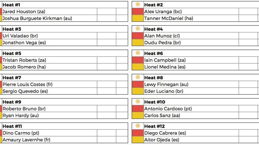 Vega tendrá enfrente al brasileño Uri Vadalao, que también venció en su heat con un 13,60 al local Lionel Medina (subcampeón del Pro Junior), quien también pasa a tercera ronda y se verá las caras contra el campeón mundial de 2017 Ian Campbell, quien ya estaba clasificado desde la primera ronda.