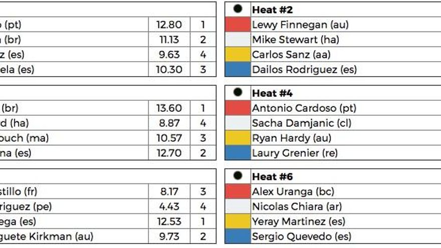 El grancanario Carlos Sanz ganó su heat con una puntuación de 13,57, por delante del australiano Lewy Finnegan, el local Dailos Rodríguez y la leyenda del bodyboard Mike Stewart (54 años), que quedó eliminado en última posición con 9,93 puntos.