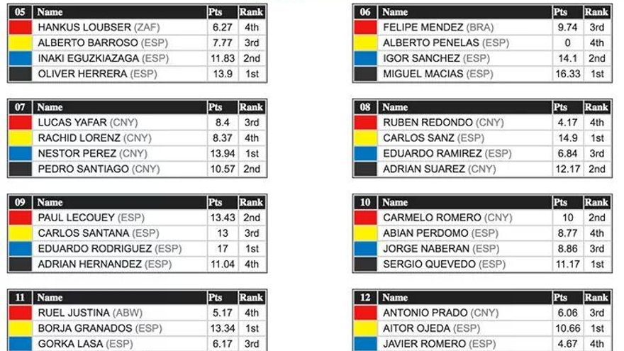 Miguel Macías consiguió clasificarse primero en su manga, mientras que Néstor Pérez, Carlos Sanz, Eduardo Rodríguez, Sergio Quevedo, Borja Granados y Aitor Ojeda fueron los competidores que lideraron cada uno de sus enfrentamientos.