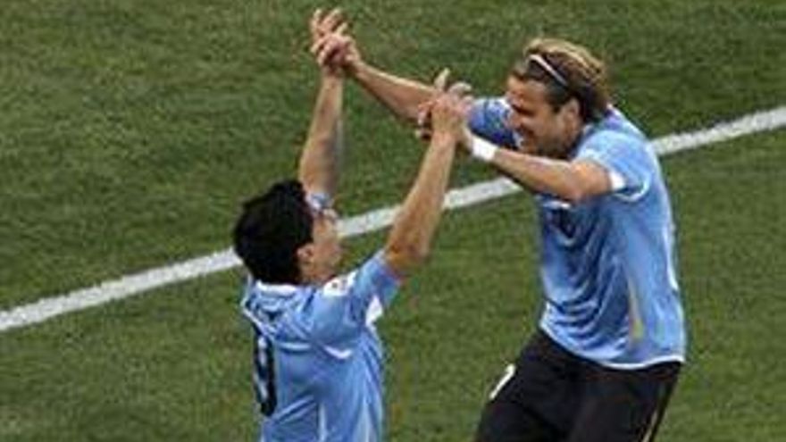 Sin embargo, la prueba de la categoría de la delantera de Uruguay la trajo el gol, cuando Forlán envió un pase a la banda derecha para que Cavani asistiera a la perfección para que Luis Suárez cabecera para batir al Conejo Pérez.