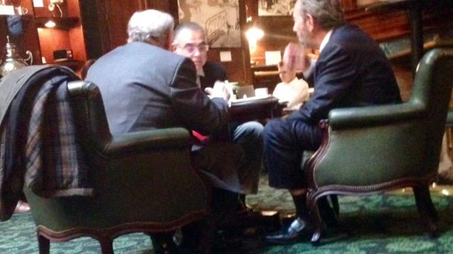 Mientras Bravo de Laguna se desgañitaba desde su púlpito del Náutico clamando contra Tenerife, este miércoles, en Madrid, podíamos captar esta otra fotografía de la jornada. Está tomada en la señorial cafetería del hotel Palace, y en ella puede verse en animada charla a dos de los más activos representantes del empresariado grancanario, y por ende, del ultraconservador Círculo de Empresarios de Gran Canaria, estrella y guía del combate contra la pérfida Nivaria y contra cualquier gobierno regional en el que no esté el PP. Junto a ellos, uno de los factótum más destacados del liberalismo tinerfeño y del renacer de ATI, el presidente de la Ceoe, José Carlos Francisco. Los dos grancanarios son, a la izquierda, de espaldas, Mario Rodríguez, propietario de las clínicas y hospitales San Roque, y a la derecha, el máximo exponente y teórico del liberalismo canarión, Sergio Alonso, presidente del Grupo Domingo Alonso. Ignoramos por completo –para qué les íbamos a engañar- de qué estaban hablando, pero nos lo podemos imaginar y nos lo reservamos. Sí apreciamos que la voz cantante la llevaba el tinerfeño, que parecía estar explicando un proyecto de largo alcance a sus interlocutores. Terminaremos cuadrando el contenido de la reunión. Por cierto, los tres acudían todos ellos al almuerzo que protagonizó el ministro de Economía, Luis de Guindos, en La Cúpula del Palace.