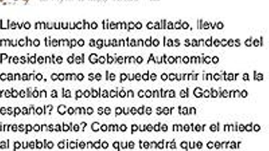 Sin salir de las redes sociales y otras redes en las que siempre se mueve el ministro en jefe, la jiribilla de las últimas horas hasta la erupción del Volcán conejero ha sido el movimiento de algunos empresarios contra el nuevo cabeza de turco de la crisis y culpable de todos los males que afectan a la economía, a falta de Zapatero: Paulino Rivero. Y todo se ha fraguado a raíz de una aparente entrada espontánea en su muro de facebook de Oliver Alonso, de los concesionarios de coches Domingo Alonso SA. Hace un par de días, el hijo de Sergio Alonso colgó un “ya no aguanto más” y cargó contra Rivero por sus declaraciones alertando del cierre de escuelas y hospitales. Oliver, que de tonto no tiene un pelo, criticó a Rivero exigiendo que antes de alarmar a la población con esos cierres, eliminara o privatizara empresas públicas y redujera, él mismito, municipios, e incluso pidió al presidente del Gobierno que hiciera feliz a los canarios marchándose para su casa. La entrada tuvo veintipico apoyos, pero sobre todo una gran caja de resonancia al hacerse eco inmediato Canarias7 en su edición de papel del miércoles. Y lo que parecía producto de la opinión libre de Alonso ha terminado en un sondeo formal de empresarios sobre la figura de Rivero en el mismo periódico, pero todo tiene un origen muy, pero que muy soriano...
