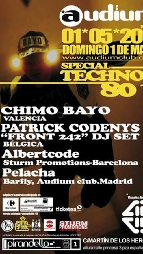 Chimo Bayo, que no actuaba en eventos de este tipo en Madrid desde hacía tres años, compartirá cabina con un set especial de Patrick Codenys, integrante de Front 242, uno de sus referentes; y Albertcode dj, uno de los artistas nacionales con mayor influencia en el EBM, ha informado 'Audium', una de las sesiones más importantes de música de electrónica de la noche de los sábados de la capital.