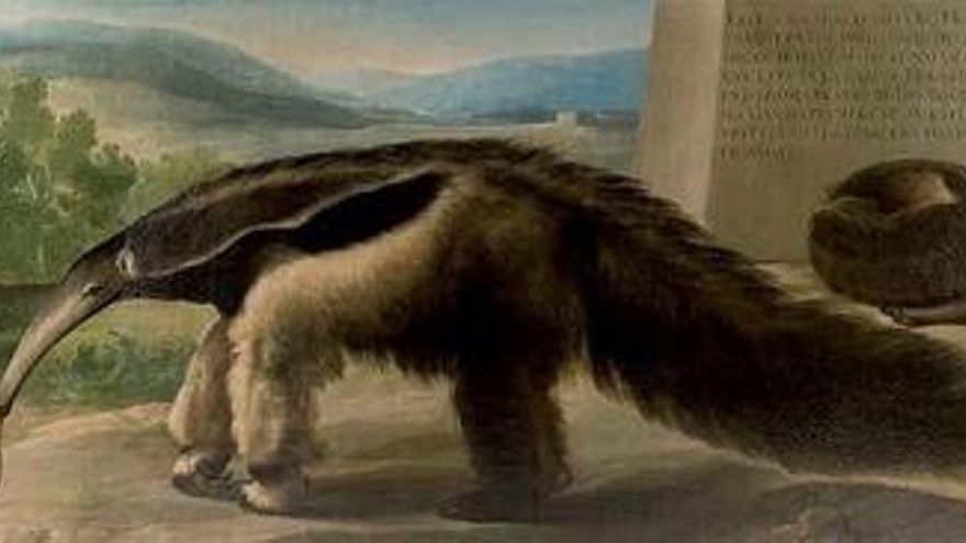 Dicho cuadro, un óleo sobre lienzo de 105 por 209 cm, representa una hembra de oso hormiguero gigante procedente de Buenos Aires que fue regalada al rey Carlos III en julio de 1776. El monarca ordenó el traslado del exótico ejemplar al Buen Retiro al tiempo que encargó su retrato, pintado bajo la dirección de Anton Raphael Mengs, primer pintor de cámara.