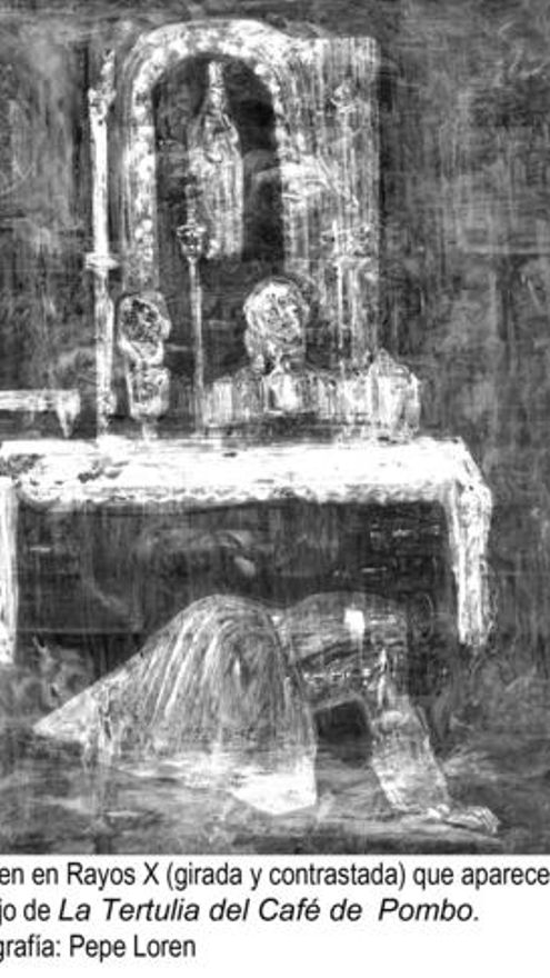 Al digitalizar las placas en un escáner dejó al descubierto que bajo las figuras del 'Café de Pombo' hay -y se distingue con absoluta nitidez- una pintura de carácter religioso donde se aprecia un altar barroco y delante una penitente.