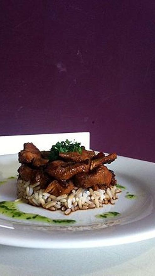 En primer lugar, se ataca el arroz. Se hierve, se escurre y se reserva, mientras se preparan las pechugas, que hay que filetear primero y cortar en tiras finas, después.