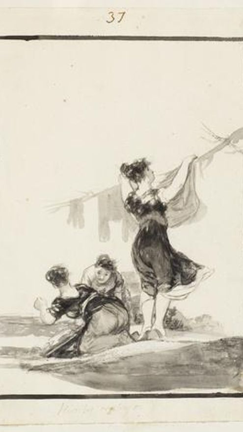 Peronnet explica que a Goya le gustaba “yuxtaponer” los temas de sus dibujos. Como ejemplo, señala que en esta pieza aparecen unas mujeres realizando labores domésticas, mientras que en otra de la misma serie, que fue adquirida por El Prado y se expone actualmente, la temática es distinta.