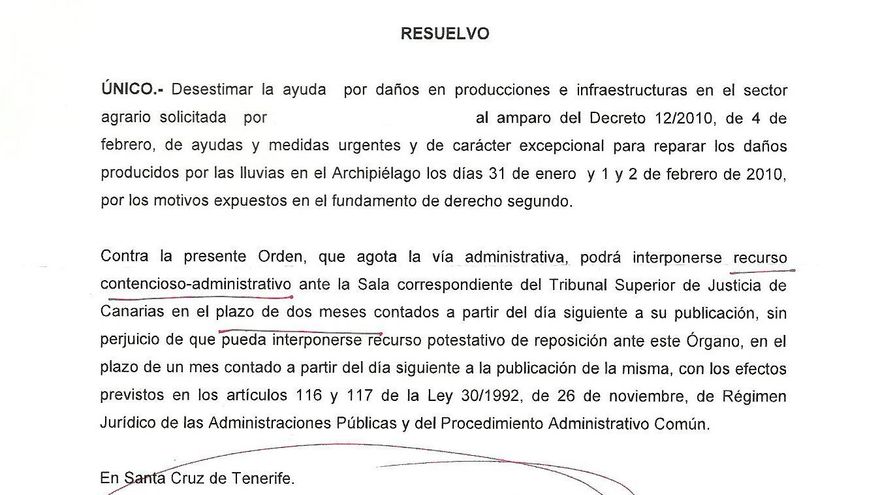 Las órdenes de desestimación de los citados apoyos, que no se han publicado de forma conjunta en el BOC, sino que han sido dirigidas de manera particular a cada peticionario de las ayudas o subvenciones previstas en aquel decreto específico (al menos así ha sido para los agricultores y ganaderos), tienen fecha de firma electrónica en torno a principios de marzo de este año. En ellas se justifica la anulación de los apoyos para compensar los daños en producciones e infraestructuras agrarias ocasionados por el temporal de viento y lluvia que se activó el 31 de enero de 2010 en la “falta de existencia de crédito adecuado y suficiente”.