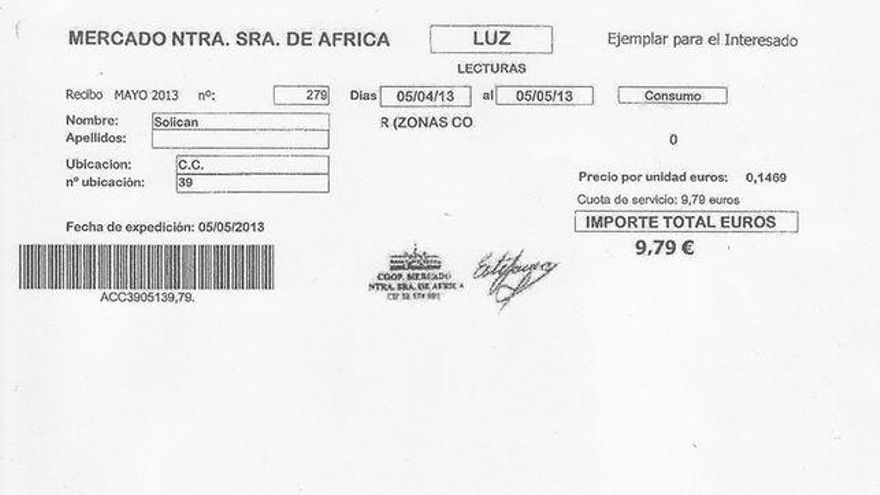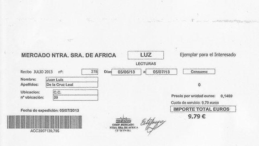Así, durante meses, el local estuvo enganchado a las zonas comunes del centro comercial, suministro por el que De la Cruz abonaba una cantidad mensual de 9,79 euros, tal y como figura en los recibos sellados y firmados por la presidenta de la cooperativa del mercado, Estefanía Hernández.