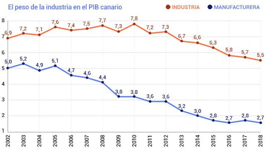 Mientras la agricultura, la ganadería y la pesca representan un marginal 1,5% de la economía regional, el sector secundario (excluyendo la construcción), llamado a alcanzar un 10% del PIB este año según la Estrategia de Desarrollo Industrial de Canarias de 2009 a 2020, proporcionó en 2018, cuando el PIB de Canarias ascendía a 45.719.556 euros, un 5,5%, una cifra que supone el 2,7% si se desagrega la manufacturera.