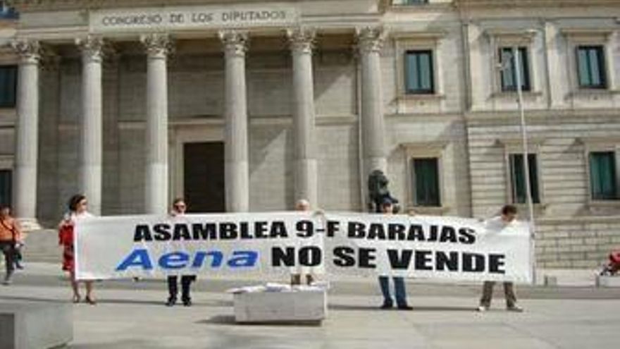 Trabajadores de la Asamblea 9-F del aeropuerto de Madrid-Barajas han entregado en el registro del Congreso de los Diputados un total de 20.000 firmas contra la privatización de Aeropuertos Españoles y Navegación Aérea (AENA), responsable de la gestión de los aeropuertos españoles.