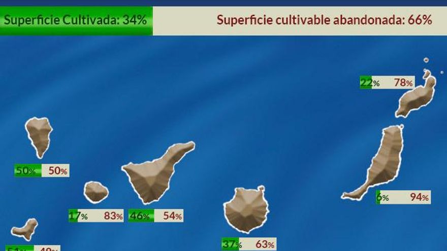 Canarias tiene una superficie total de 7.000 kilómetros cuadrados aproximadamente, lo que traducido a hectáreas (ha) daría como resultado unas 700.000. De esa cifra, la superficie agraria útil asciende hasta las 130.000 ha, es decir, el 18,75%. Según datos del Instituto Canario de Estadística, el terreno cultivado cubre 45.000 ha, mientras que el suelo agrario útil sin uso asciende hasta las 85.000 ha. (60%). Estas cifras, todas aproximadas, establecen que en 2018 el 60% de la tierra cultivable está abandonada en la Islas. En términos económicos, el sector primario ocupaba antes de 1960 (con la agricultura aglutinando la mayor parte de la economía) al 54% de la población activa y generaba el 32% del PIB. En conjunto, ese sector solo ha aportado el 1,2% de lo producido entre 2015-2017 y genera algo más de 20.000 empleos directos, según el Ejecutivo regional.