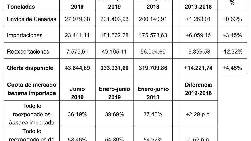 En cambio, si se analiza lo ocurrido en los mercados peninsular y balear de plátano y banana en los seis primeros meses de 2019, los consumidores han tenido a su disposición unas 333.932 toneladas, 14.222 más que el año pasado en el mismo periodo, lo que supone el 4,4% de aumento. Como desde el archipiélago se han remitido 1.263 toneladas más que en el ejercicio anterior (+0,6%) en el intervalo de análisis, la importación de banana se ha incrementado en 6.059 (+3,4%). Las reexportaciones han caído en 6.900 toneladas (-6,4%) en la misma etapa de control, el primer semestre del año.