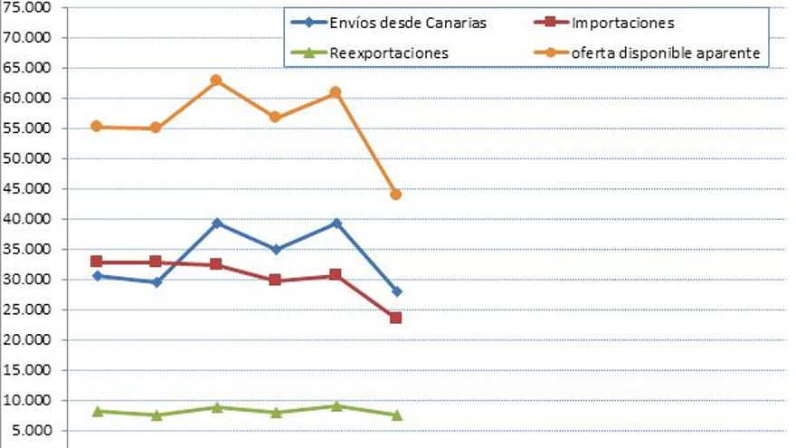 Como las reexportaciones (la fruta que llega a España y luego se manda a otros países de la Unión Europea) se elevaron a unas 7.576 toneladas, la oferta disponible aparente se habría situado en torno a las 43.845 toneladas. Comparado este registro con el del mes anterior, los volúmenes llegados desde Canarias descendieron el 28,5%; las importaciones el 23,5% y las reexportaciones el 16,4%, por lo que la oferta disponible aparente fue el 27,8% inferior a la de mayo del año en curso.