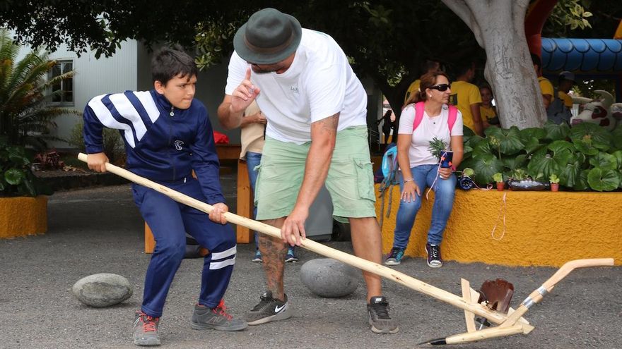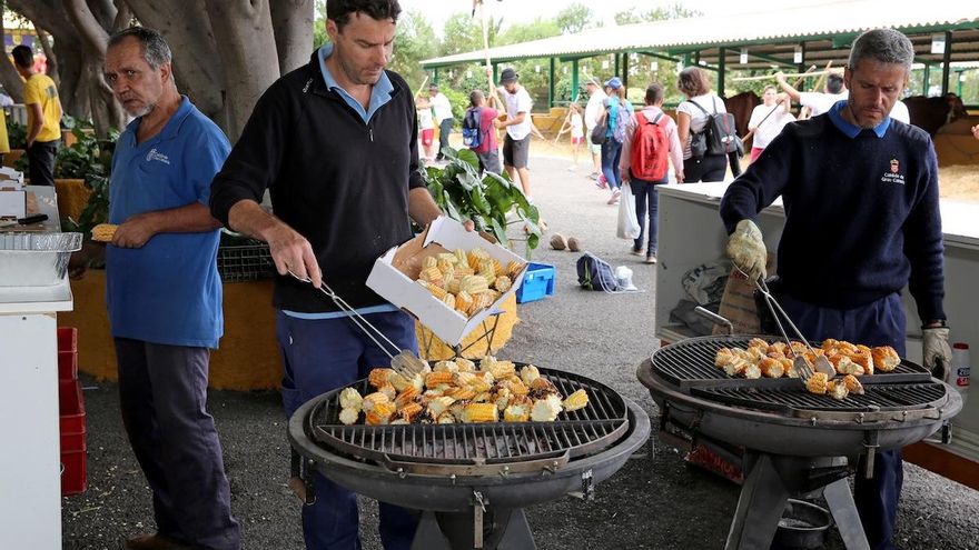 Los alumnos en prácticas de la Escuela de Capacitación Agraria, que dirigieron varios de los puestos, también enseñaron a elaborar gofio desde descamisar y desgranar la piña, al tueste del millo y el molido hasta dejarlo muy fino y hacer una pella.